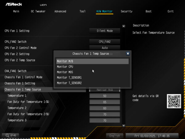 Beim X870E Taichi OCF können für die Regelung der vier Gehäuselüfteranschlüsse neben der CPU- und Mainboardtemperatur auch die beiden optionalen Thermofühler sowie die Temperatur der Spannungswandler herangezogen werden. Damit lassen sich die Gehäuselüfter fast optimal justieren. Eine Überwachung der Grafikkartentemperatur wäre hier noch wünschenswert gewesen, denn eine Mittelklasse Grafikkarte verbraucht ca. 300-400W und erzeugt damit deutlich mehr Wärme als die stärksten Desktop-Prozessoren.