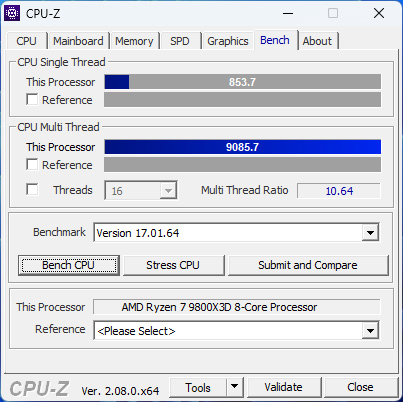 Im CPU-Z Benchmark erreichten wir mit dem Taichi OCF und dem 9800X3D Prozessor 853,7 Punkte auf einem Kern und multi threaded stattliche 9085,7 Punkte.