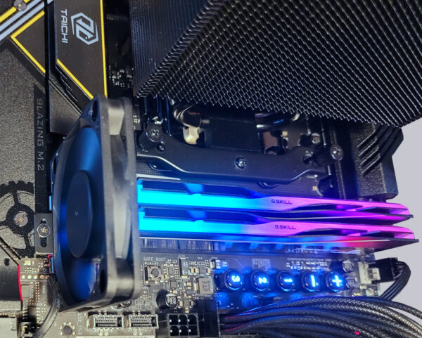 Da trotz weiterer Spannungsanhebung auf 1,9V keine höhere Taktfrequenz mehr erzielt werden konnte, gehen wir davon aus, dass bei DDR5-8500 unser eingesetzter Ryzen 9800X3D Prozessor sein Limit erreicht hat. Eine verbesserte Kühlung ist bei DRAM Spannungen ab 1,5V dringend anzuraten. Wenn der Einsatz einer Wasserkühlung für den RAM nicht möglich ist, kann der Lüfter, der dem Taichi OCF beiliegt, die Temperatur des Arbeitsspeichers ebenfalls deutlich reduzieren. Mit bis zu 6000 U/min kann er zwar auch recht störend klingen, aber für kurzzeitige Übertaktungsversuche und zum Ausloten von Limits kann er sehr nützlich sein. Bei unseren Tests verringerte der kleine Powerlüfter die RAM-Temperatur um mehr als 12°C und stellte seine Wirksamkeit damit mehr als deutlich unter Beweis.