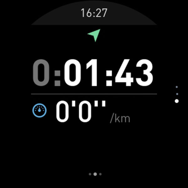 Für das vollständige Fitnessprogramm ist natürlich auch eine App installiert. Einmal am Homescreen der Smartwatch nach rechts gewischt, ist man schon in der Fitness App und braucht nur die aktuelle Übung auswählen. Laufen im Freien, Spaziergang, Laufen am Laufband, Radfahren, Workout und Schwimmen stehen zur Auswahl. Am Hauptscreen der Lauf-App sieht man die Trainingszeit, die zurückgelegte Distanz und die aktuelle Pulsfrequenz.