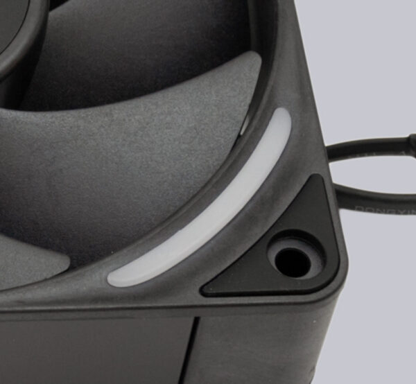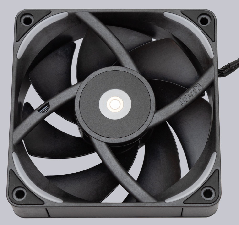 Alle Kanten des 7-blättrigen Rotors sind absolut perfekt verarbeitet. Es ist keinerlei Grat vorzufinden und die Spaltmaße sind gleichmäßig gering. Ein Hybridlager stabilisiert den bis zu 3100 U/min schnell laufenden Rotor magnetisch und hydrodynamisch, jedoch bietet der 6-polige Antriebsmotor keine Möglichkeit zum Stillstand. Mit mindestens 340 U/min dreht der Lüfter deshalb immer. Dank PWM-Ansteuerung lässt sich der F120X über das gesamte Drehzahlband fein regeln und auf den jeweiligen Anwendungsfall abstimmen, denn nicht immer braucht man 176,7 m³/h Luftdurchsatz und 7,53 mmH2O statischen Druck, die der F120X umzusetzen vermag. Damit die visuelle Performance nicht hinterherhinkt, spendierte NZXT dem F120X insgesamt 16 adressierbare RGB LEDs, die sich in den Ecken hinter milchigen Einsätzen befinden.
