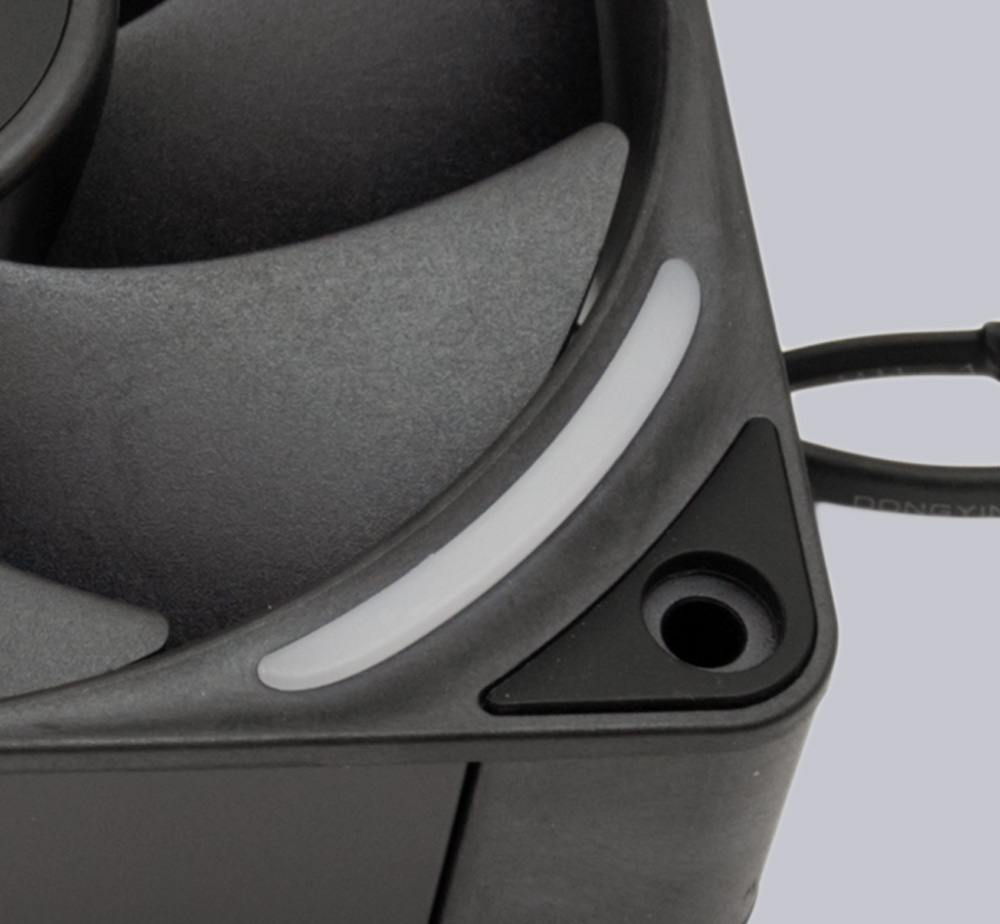 Massive, geschwungene Streben verleihen dem Rotor auch bei gehobener Windstärke ausreichende Stabilität. In den Streben wurden nahezu unsichtbar die Kabel verlegt, die gesammelt an einem Punkt aus dem Rahmen heraustreten. Leider verfügt der F120X lediglich über einzelne Stecker für den Lüftermotor und die RGB-Beleuchtung an den Enden der 600mm langen Anschlusskabel, sodass man zur Kaskadierung mehrerer Lüfter die erforderlichen Splitterkabel selbst organisieren muss. Neben den Standard-Steckern für Lüftermotor und A-RGB-Beleuchtung besitzt der F120X auch noch einen proprietären NZXT Stecker für die RGB-Beleuchtung. Abgerundet wird das Ausstattungspaket durch schwingungsdämpfende Gummis, die beidseitig an allen vier Ecken vorhanden sind.