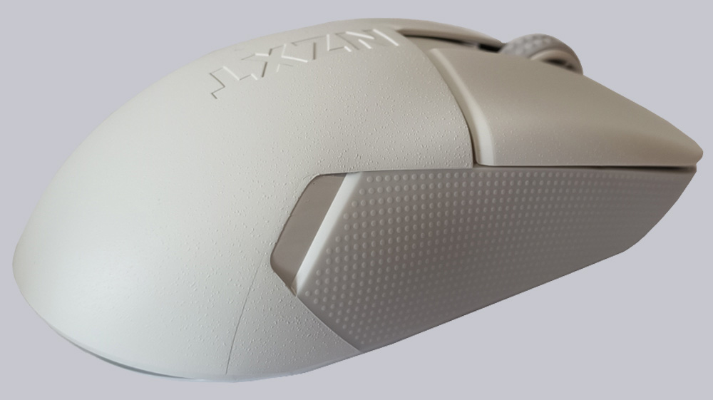 Die Lift Elite Wireless verfügt über ein NZXT Logo in Form von Vertiefungen auf der Oberseite. Bei der NZXT Lift 2 Ergo war dieses noch als kaum herausstechender Schriftzug angebracht. In der Nahansicht zeigt sich eine leicht rauhe Oberfläche der Maus.