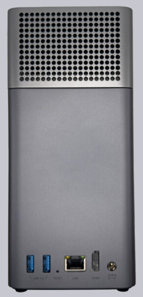 Auf der Rückseite finden sich dann zwei USB-A Anschlüsse, ein 1Gbit Netzwerk- und ein HDMI-Anschluss sowie die 12V Buchse für das externe Netzteil. Eine kleine Öffnung ermöglicht den Zugang zu einem Reset Taster.