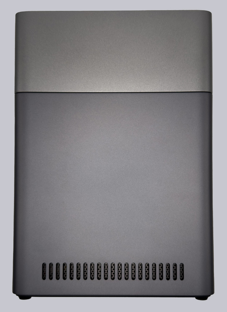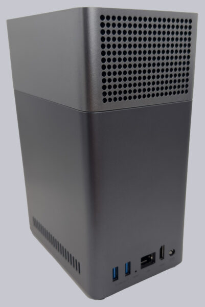 Der Rest des Gehäuses, der auf 4 kleinen Füßen steht, um die Luftzirkulation der Lüfterauslässe an der Unterseite zu gewährleisten, ist mit einem Ein-/Ausschaltknopf, 3 LEDs und einem USB-C Anschluss an der Vorderseite versehen.