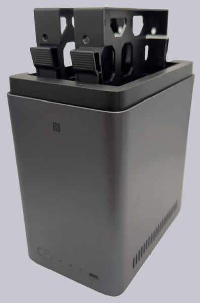 Nachdem wir das NAS von seiner Plastikhülle befreit haben, kann der obere Deckel abgenommen werden, der die beiden senkrecht angeordneten Laufwerksschächte und die dazugehörigen Einsätze für die Festplatten freigibt. Die Einsätze sind mit „1“ und „2“ beschriftet, aber nicht codiert. Die Unterscheidung erfolgt also nur optisch, das System selbst kann die Einsätze nicht unterscheiden.