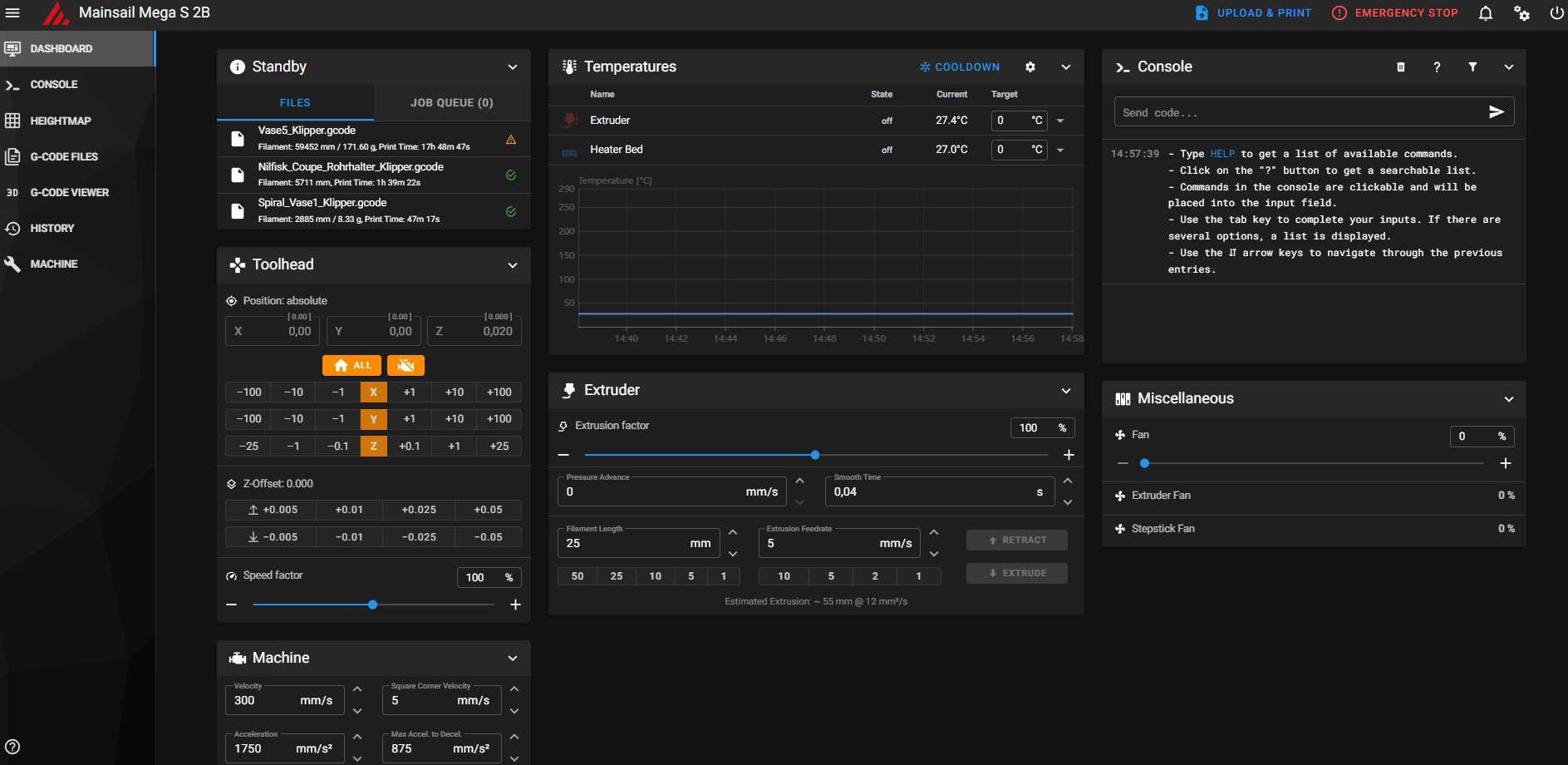 To do this, switch to the “Dashboard” via the left menu bar and click on the house. On the right, the temperatures are displayed in the graphics area. If the correct ambient temperatures are already displayed there, things look good and you can carefully heat up to a low temperature by entering the desired target temperature under “Target” and confirming it. Afterwards you should calibrate the E-Steps – for Klipper this is called “rotation_distance” and is stored in the “Extruder” section of the Printer.cfg configuration file.